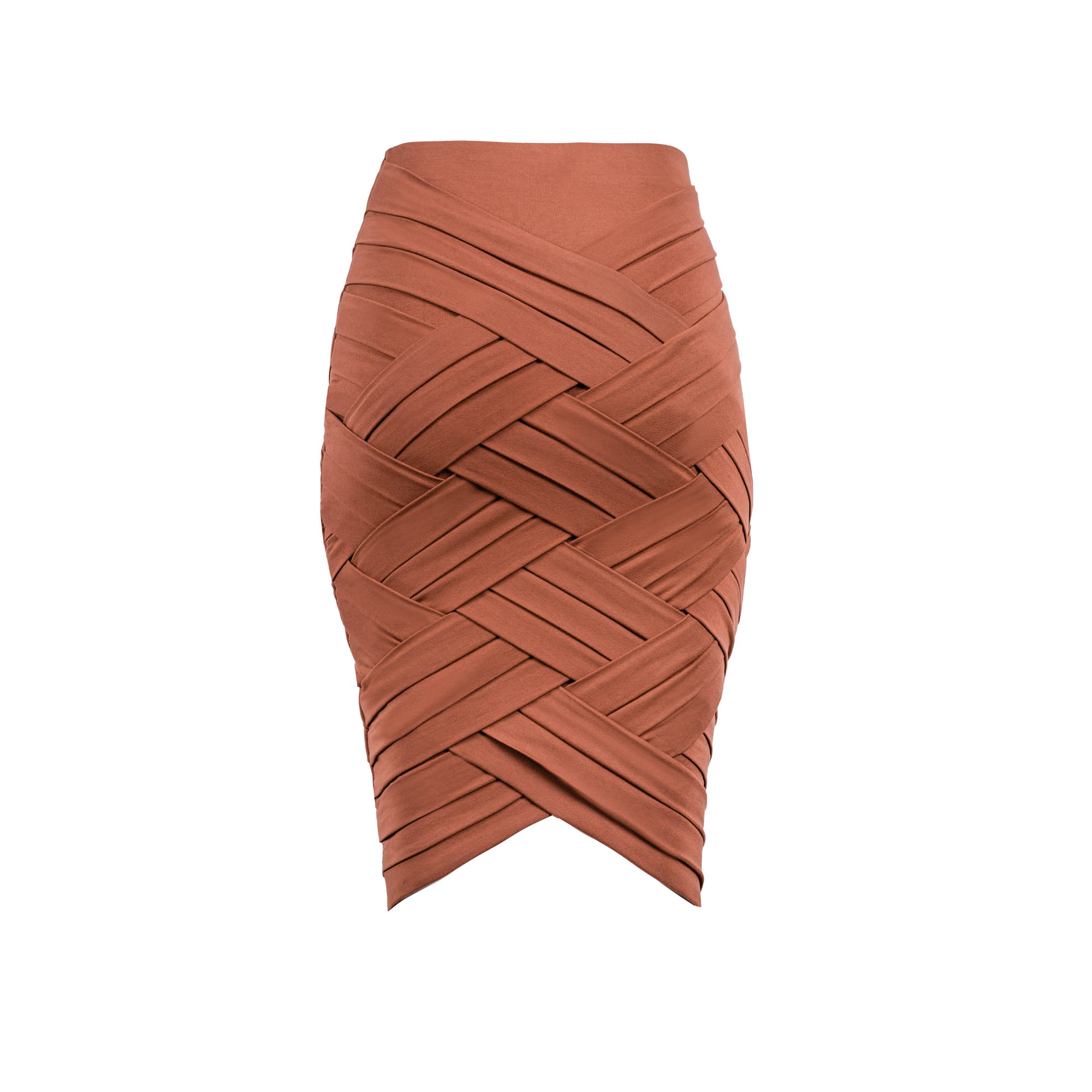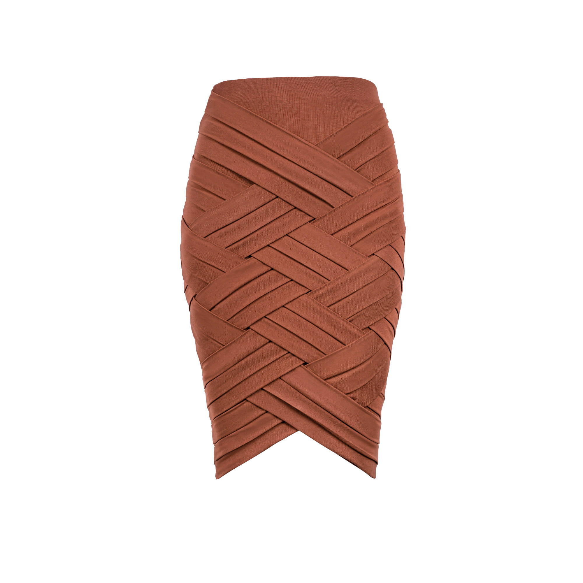 Elegancka spódnica ołówkowa z wysokim stanem w kolorze cynamonowym (brąz/karmel) wykonana z wysokogatunkowej cienkiej, elastycznej dzianiny. W talii wykończona gumą.