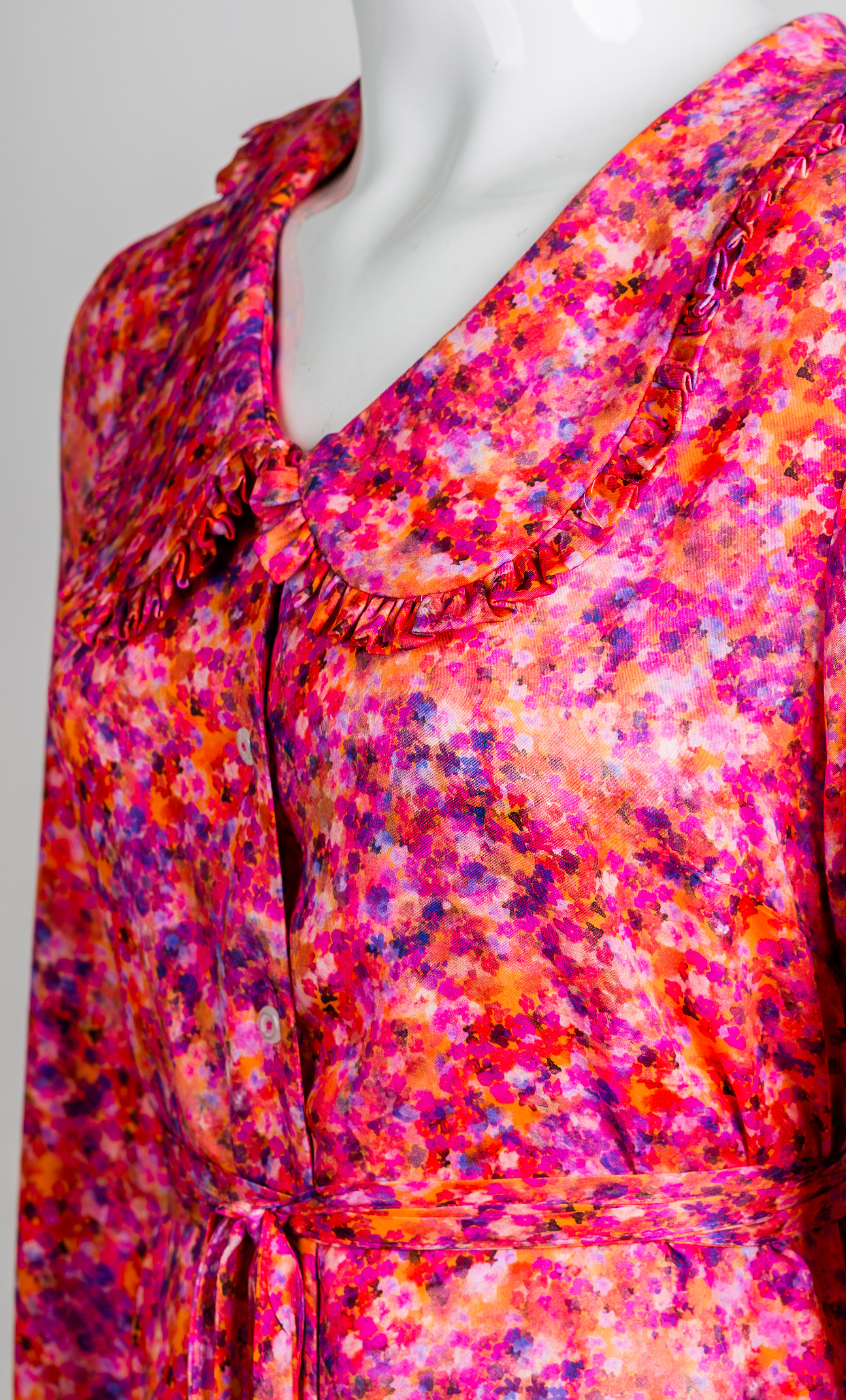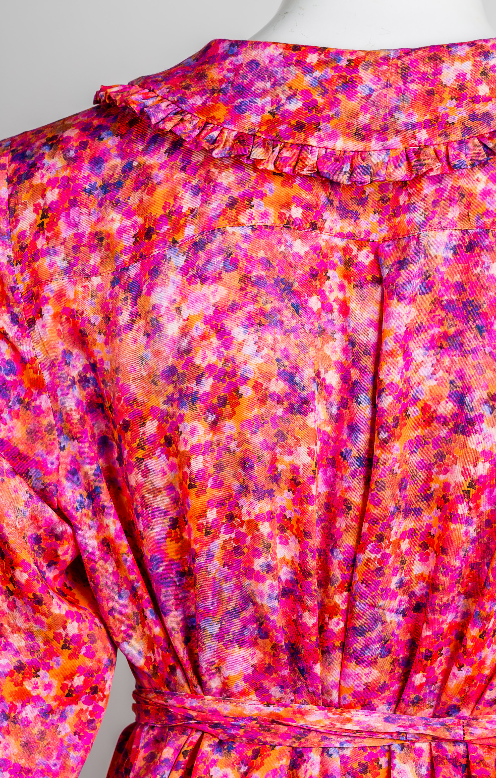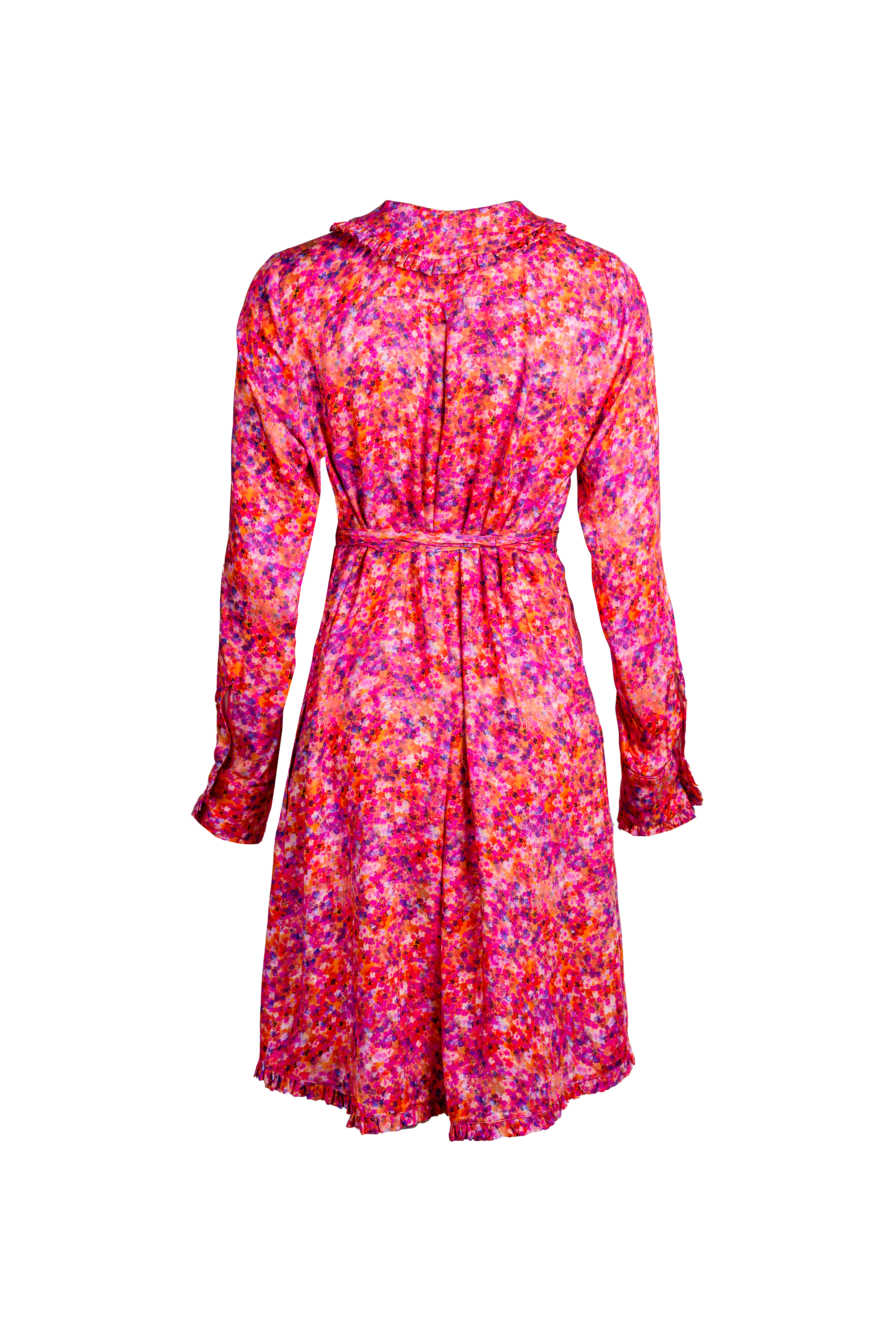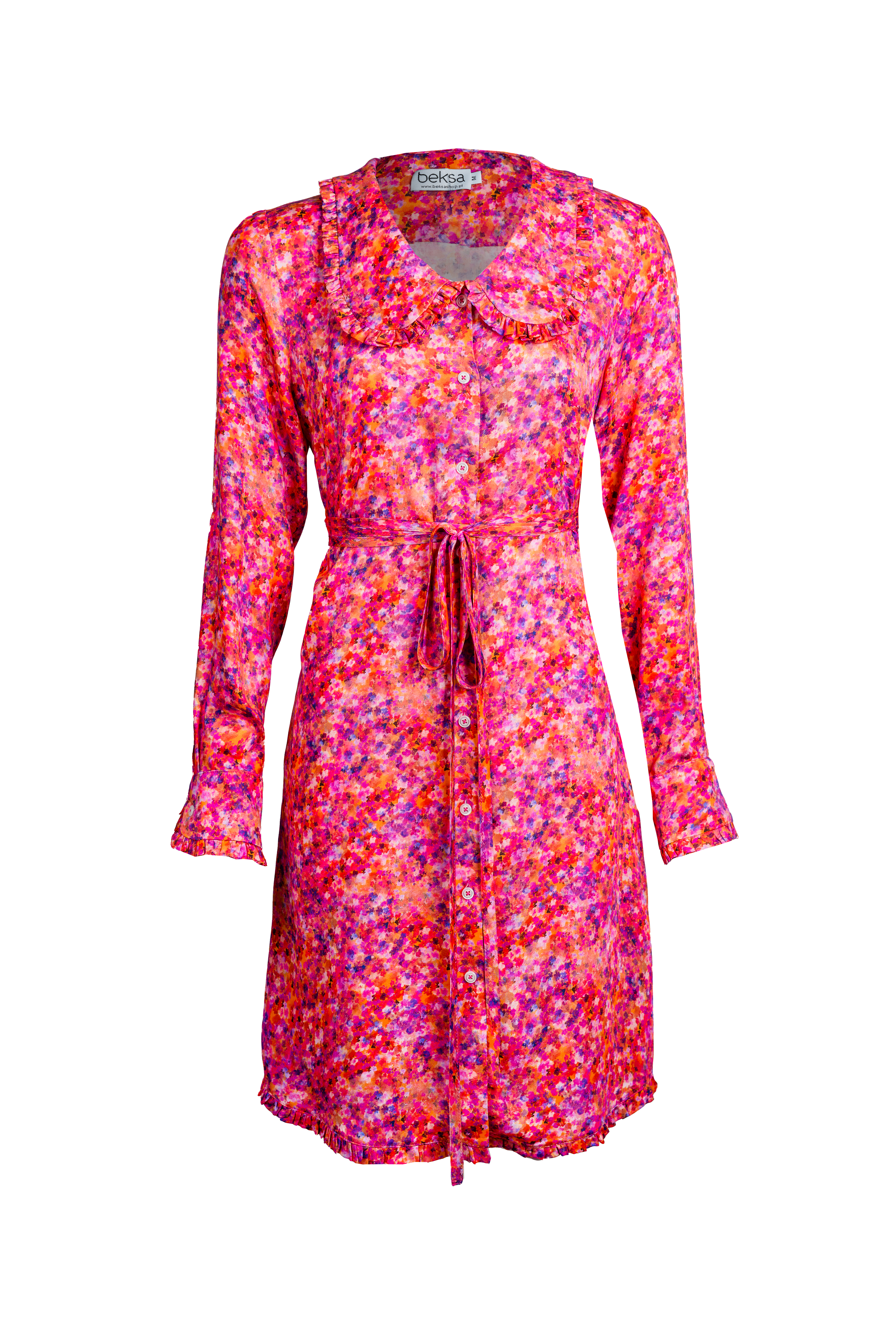 Sukienka KOSZULOVA na guziki, z dołączonym cienkim paskiem do związania w talii, wywijany koszulowy kołnierzyk w wersji bebe. Dół sukienki, kołnierz i mankiety zostały obszyte małymi falbankami. Długość do kolan/lekko za (w zależności od wzrostu). Z przodu i z tyłu delikatnie dłuższa, boki lekko wycięte. Materiał jest lejący i lekki, nie jest sztywny.
