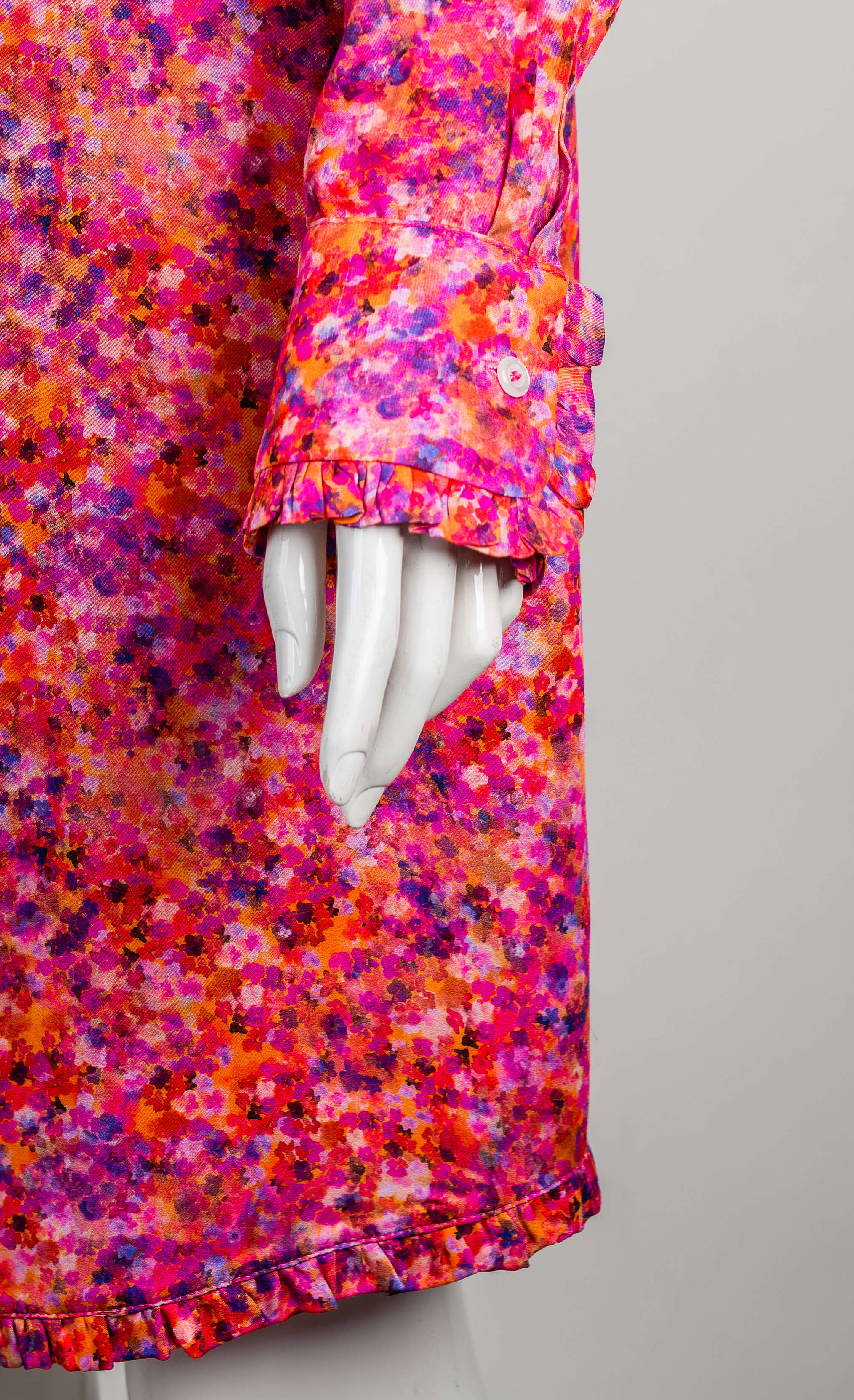 Sukienka KOSZULOVA to kolejna wersja tego uniwersalnego modelu. Dzięki swojej koszulowej górze pozwala na swobodną stylizację do pracy, na uczelnię, czy inne służbowe wyjścia. Lekki materiał nie zbiera się pod np. marynarką i nie zwija pod pachami. Z kolei z podwiniętymi rękawami i tenisówkami może stworzyć stylizację na luźniejsze, casualowe okazje. Modny kwiatowy wzór pozwala na bardziej kobiece i romantyczne looki. Kolorystyka: róż, fiolet, akcenty pomarańczu.