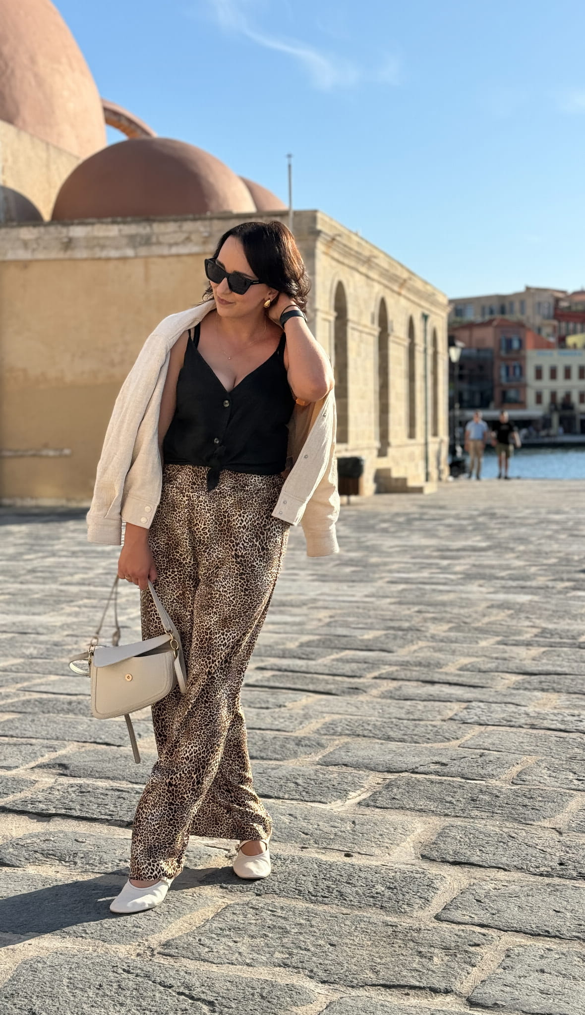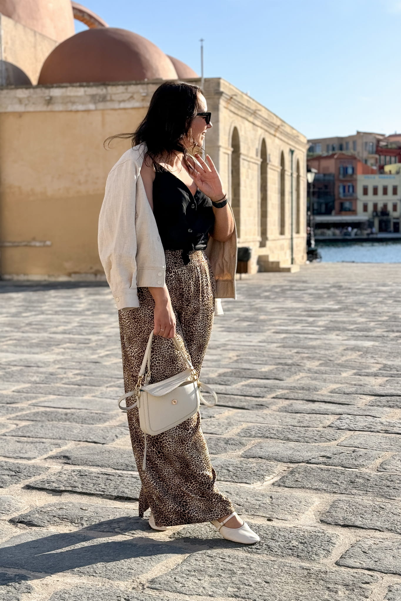 Wzór w panterę w odcieniach beży, kremowgo oraz czerni.
