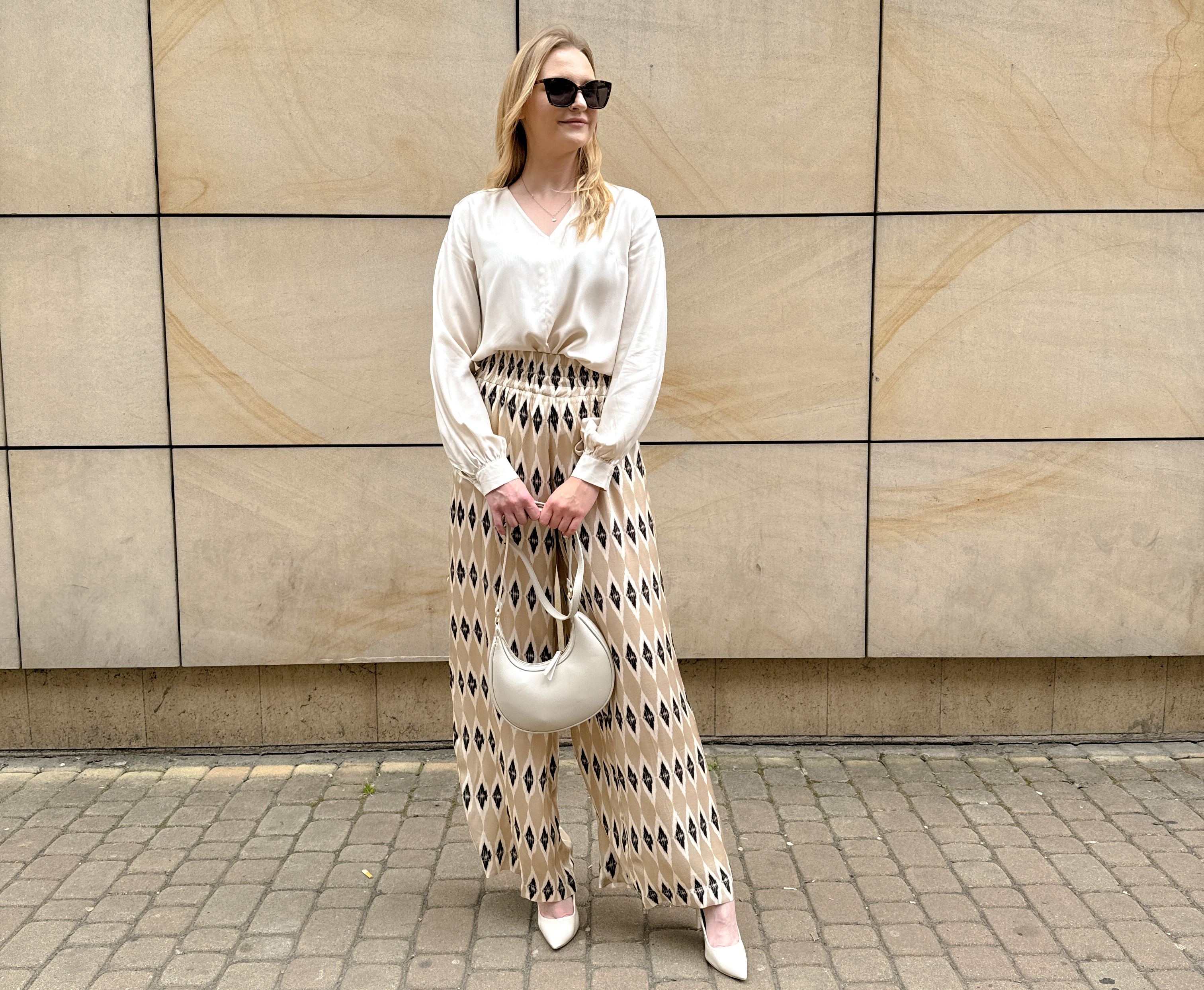 Niebanalne spodnie kuloty z wysokim stanem z kieszeniami w szwie bocznym. Wykonane z wysokogatunkowej tkaniny wiskozowej. Spodnie talii zostały wykończone szeroką gumą przeszytą po wierzchu.