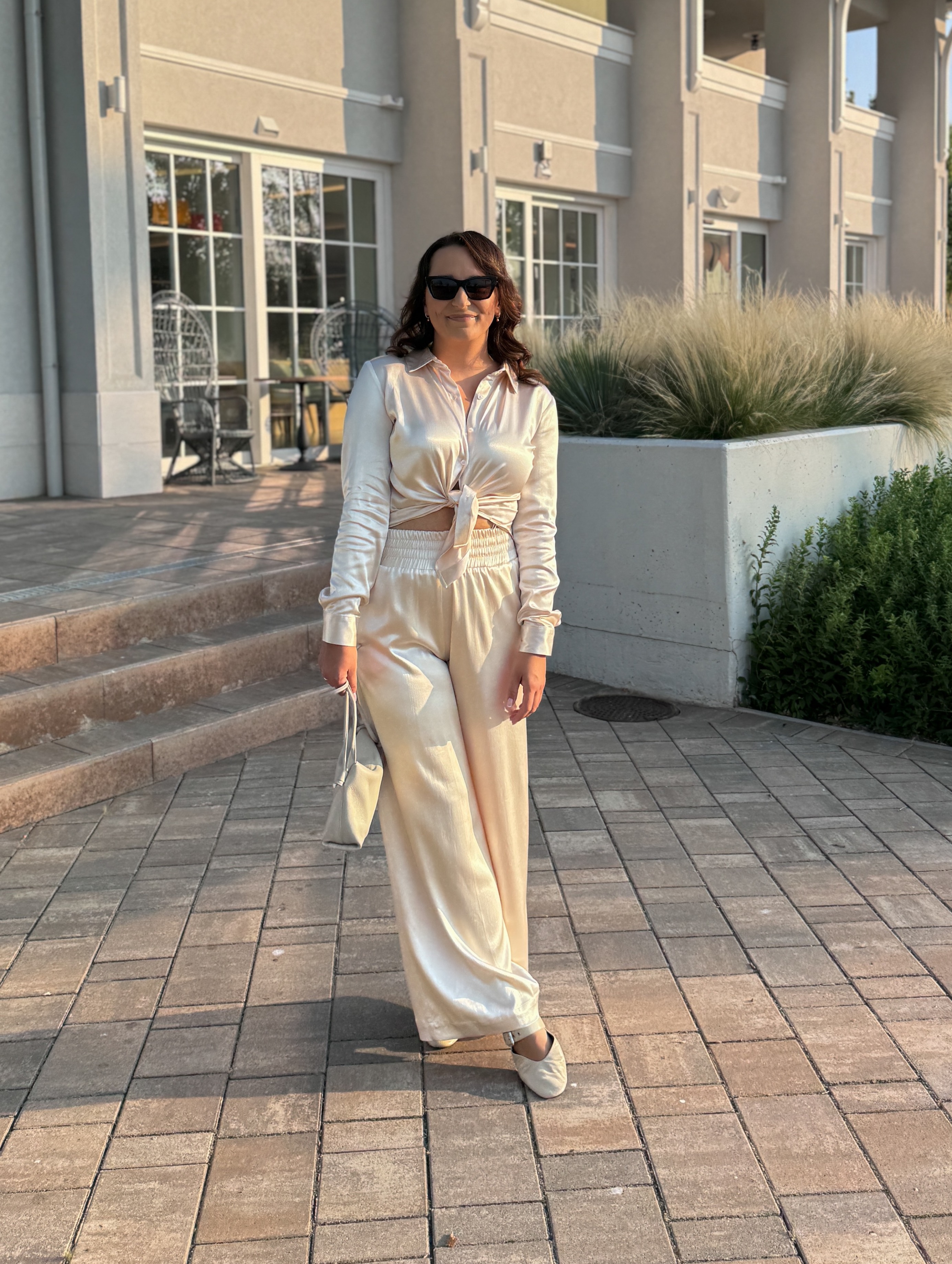 Tkanina wiskozowa z elastanem, splot satynowy - bardzo przyjemna w dotyku i wygodna w użyciu.