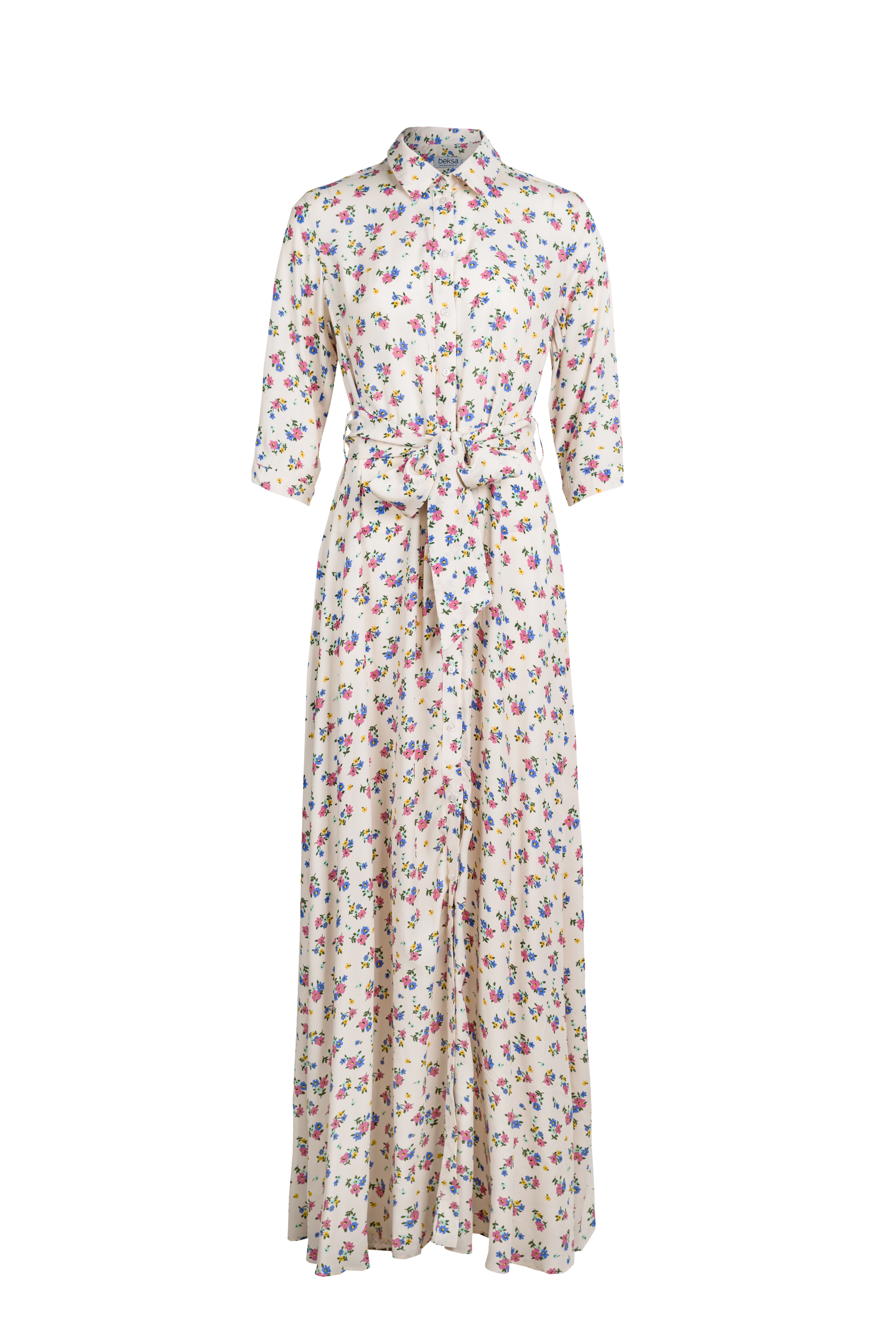 Sukienka ma długość maxi, jest zapinana na guziki i posiada koszulową górę z kołnierzem. Talia jest subtelnie podkreślona, a dołączony materiałowy pasek pozwala na regulację szerokości oraz długości – możesz lekko podciągnąć sukienkę, dopasowując ją do swojej sylwetki. Rękawy 3/4 zakończone są delikatnymi mankietami z guzikami.